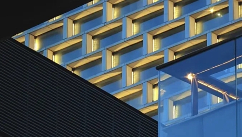 城發(fā)中心以“嵩山書頁巖”為設(shè)計理念,以中空LOW-E玻璃打造極簡幕墻立面,玻璃寬約3米,隱藏式開啟窗。